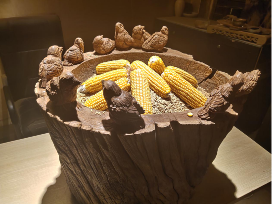 选用具有百年历史的老老木臼为材料,沿用原有外形,在中间陈设五谷杂粮,四周雕刻十只形态各异的麻雀,讲述人与自然的和谐。