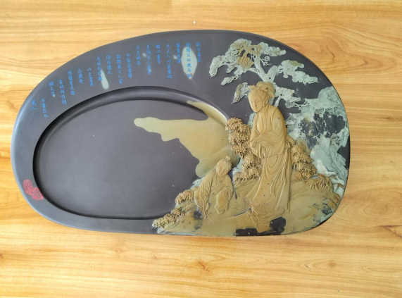 以石材的自然色彩进行雕琢,呈现“欧母画荻”的故事场景。
