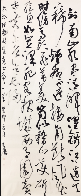 李历的书法作品《陆游诗<成都书事>》,采用八尺条幅形式,用黄庭坚大草笔意书写陆游诗《成都书事》一首,整幅作品枯湿浓淡对比强烈,有较强的立体效果,结体稳中求险,中锋用笔显流畅,枯笔突现苍劲,整体大气磅礴。