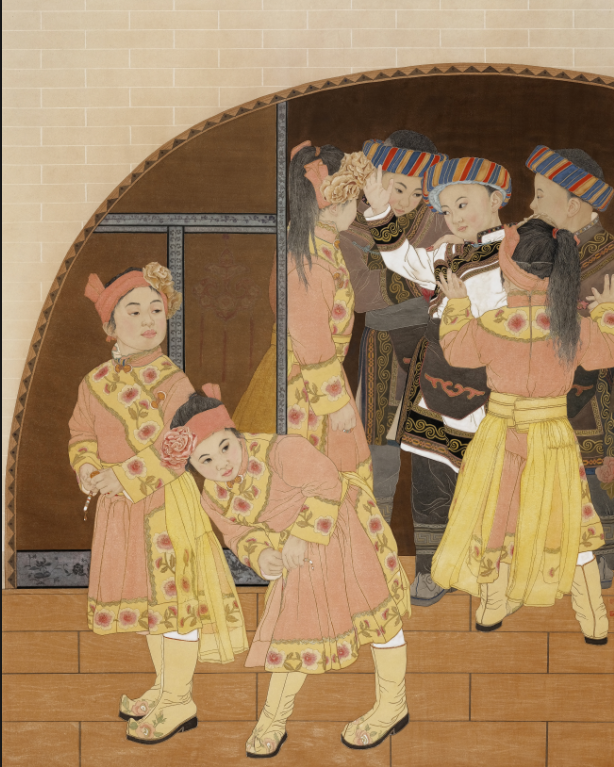 陈莉的中国画《文艺小骑兵》,描绘了羌历年期间,羌族人民欢天喜地庆祝节日,一群羌族小孩准备上台表现节目,他们互相鼓励互相招呼的场景,作品表现了孩子们天真可爱的形象,以及上台前的喜悦之情。
