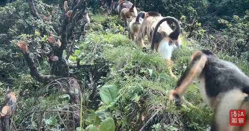 在视频中,可见有四五只小猴子,紧紧地抱着猴妈妈,从红外相机前依次走过。随后,它们在林间跳跃,悠闲惬意。