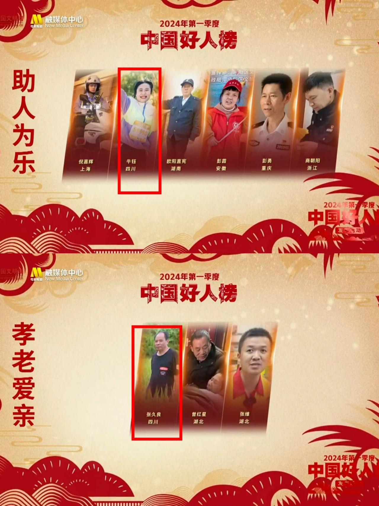 近日,中央精神文明建设办公室发布2024年第一季度“中国好人榜”,本次发布全国共152人(组)上榜,四川4人上榜。其中绵阳2人,他们是——“助人为乐”中国好人牛钰和“孝老爱亲”中国好人张久良。