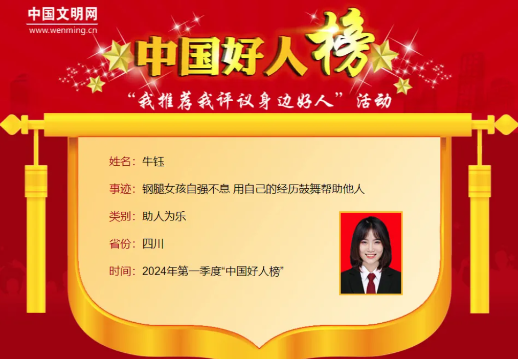 在“5·12”汶川特大地震中,牛钰失去右腿。之后,她安装假腿参加了马拉松、上海时装周等活动,用行动感染着身边的残疾人。她出版《黑暗的星星》一书,引导残疾人正视身体缺陷、走出心理阴霾,已成为众多残疾人的精神指引。她以自身真实经历为蓝本,创作并拍摄了超过200部公益短视频作品。这些作品不仅拉近社会大众与残疾人的距离,更在关爱、疏导层面发挥了重要作用,有力地帮助了有心理障碍的残疾人,让他们重塑生活信心。