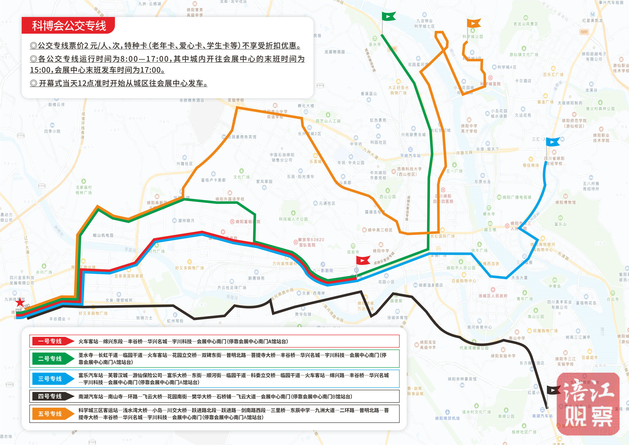 三号专线:富乐汽车站—芙蓉汉城—游仙保险公司—富乐大桥—东街—顺河街—临园干道—科委立交桥—临园干道—火车客站—绵兴路—丰谷桥—华兴名城—宇川科技—会展中心南门。??炕嵴怪行哪厦臕馆站台。