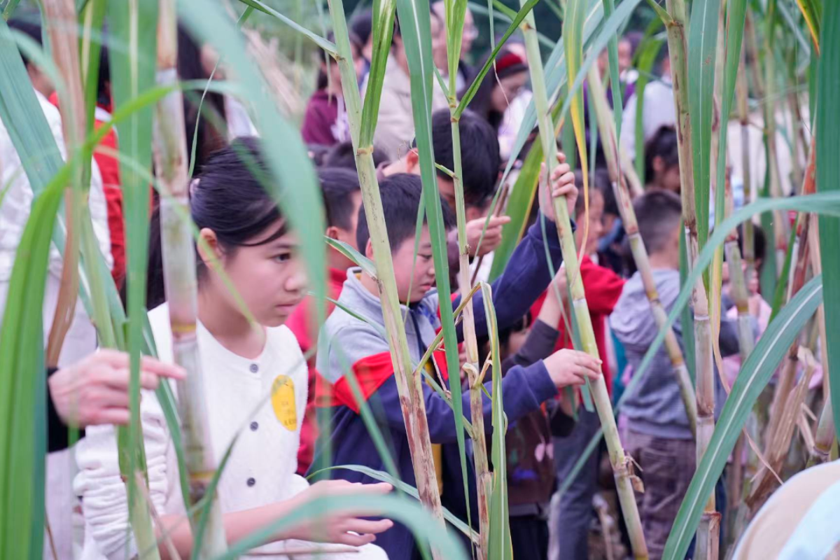 “甘蔗原产地在哪里?”“甘蔗的甜度与土壤酸碱度有什么关系?”“如何通过茎叶判断成熟度?”在阡陌之间农家乐的甘蔗种植区,研学老师通过“理论讲解+田间实操”的模式,引导学生们观察甘蔗生长特性。学生们亲手收割甘蔗并学习榨汁工艺,将课本中的生物知识转化为具象的农业认知?;疃谷谌搿按痴ブ逖椤薄昂焯前局啤钡热の痘方?,让劳动教育在欢声笑语中落地生根。