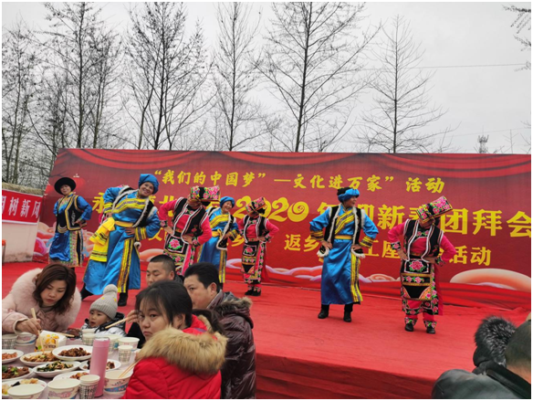 1月18日,北山村村委会洋溢着浓浓的节日气氛,大红色的舞台、身着艳丽服饰的表演团队,坝子里70余张铺着红色桌幔的餐桌在攒动的人群中显得格外耀眼。由村民自发筹办的北山村迎新团拜会暨“文明实践进乡村、返乡农民工座谈会”活动在这里举行。