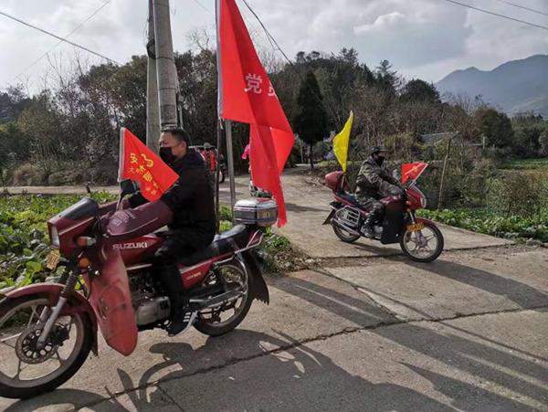 党员志愿者驾驶摩托走村入户进行全覆盖宣传