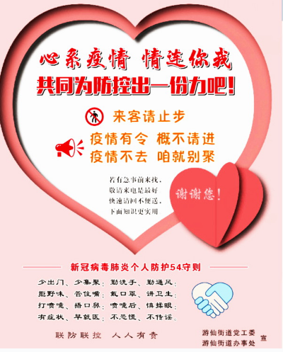 近日,四川省绵阳市游仙区居民住家门、街道商店门,出现爱心图样的特殊“门贴”:“疫情有令,概不请进;疫情不去,咱就别聚。若有急事来找,敬请来电最好;快速请回不便送,下面知识最实用.....”