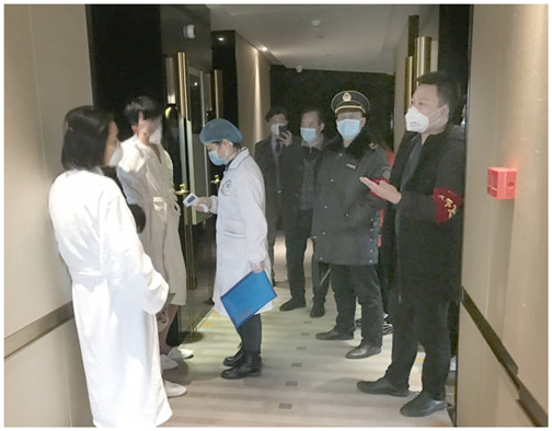 在宏泰威图酒店工作人员的帮助下,工作组来到了1213、1217两个客房的门口。“我们是辖区疫情防控工作人员,因为疫情工作需要你们配合,请支持一下……”听说是疫情防控,住在这两个房间内的李杨、赵蕾夫妻俩已知晓来访者的目的。经过一番沟通,临时工作组清楚了两个房间的住宿人员身份。