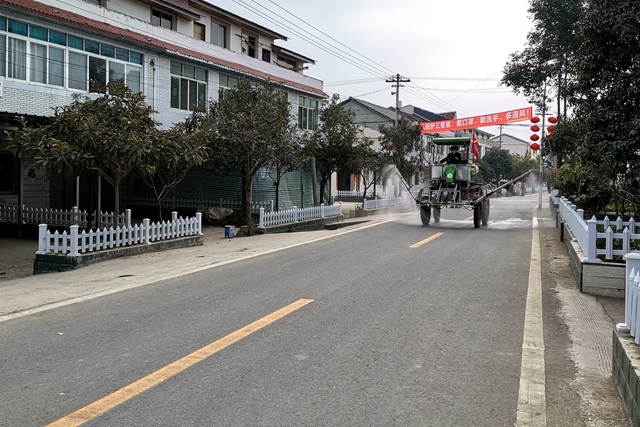 疫情期间,每天一大早,永明镇万家旺农机专合社的工人们就开始忙碌起来,他们配置好消毒液驾驶着自走式伸杆喷雾机沿着村社道路消毒,每天上午8点到12点,在村头村尾都能看到他们忙碌的身影。机身上飘扬的志愿者旗帜就是他们的统一标识。据了解,自2月2日起,万家旺植保专合社出动了15名技术人员,出动5架植保无人机、6台自走式喷雾机、10台弥雾机进行乡村义务消毒工作,空地结合,立体消杀,不留死角。