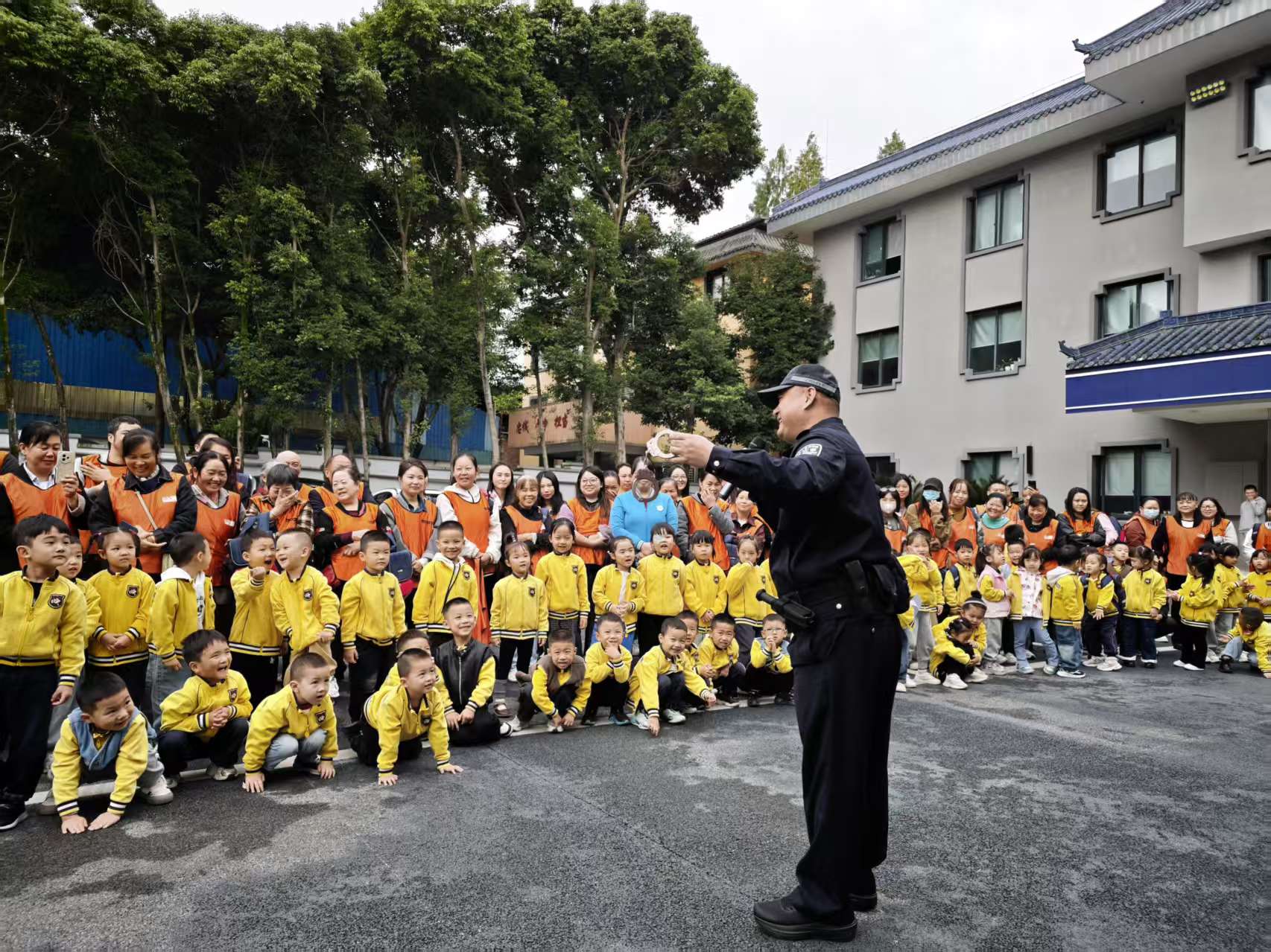 在民警的带领下,孩子们排着整齐的队伍,好奇地打量着派出所的每一处细节。