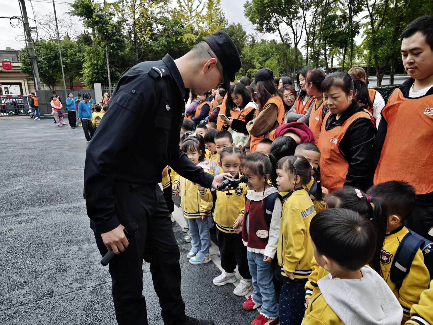演练结束后,民警还带来了趣味满满的互动环节。他们拿出警用装备,用通俗易懂的语言讲解其用途:“这个是手电筒,能在黑暗中照亮危险”“遇到陌生人要记得找警察叔叔帮忙……”孩子们好奇地触摸、观察装备,在轻松的氛围中学习安全知识,脸上洋溢着兴奋与认真的神情。