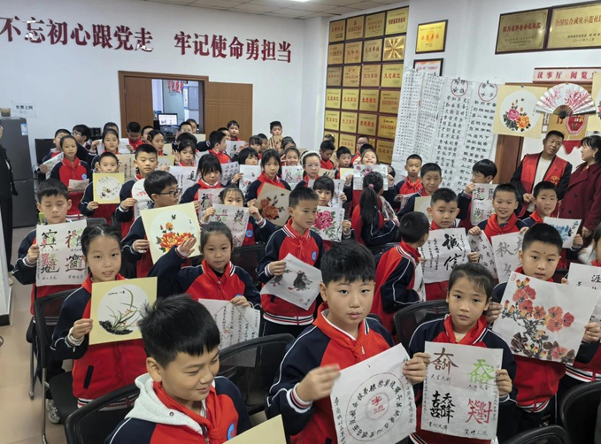 活动当天,秋雨淅沥却挡不住师生们的热情。身着统一服装的孩子们手擎鲜艳校旗,迈着整齐的步伐走进社区活动现场。墨梓园书画协会负责人生动讲述了协会长者们深耕书画艺术、热心公益事业的故事——即便岁月染白双鬓,他们仍以笔墨为媒,用书画作品传递中华优秀传统文化魅力,用公益行动诠释老有所为的担当,深深打动了在场每一位师生。